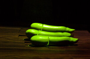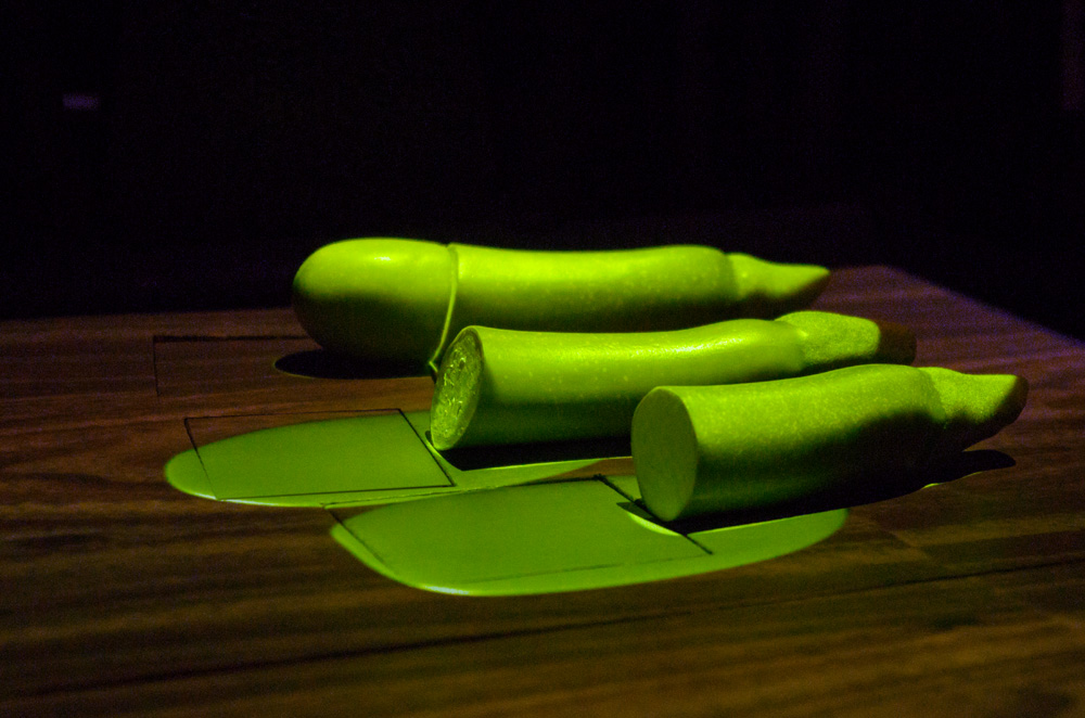 Real (well fake, but real in regards to being a 3D Object) Zucchinis, lit by a video projector. Projected wood and blood. Machinery and Projection working together. Virtual and real world connect.
